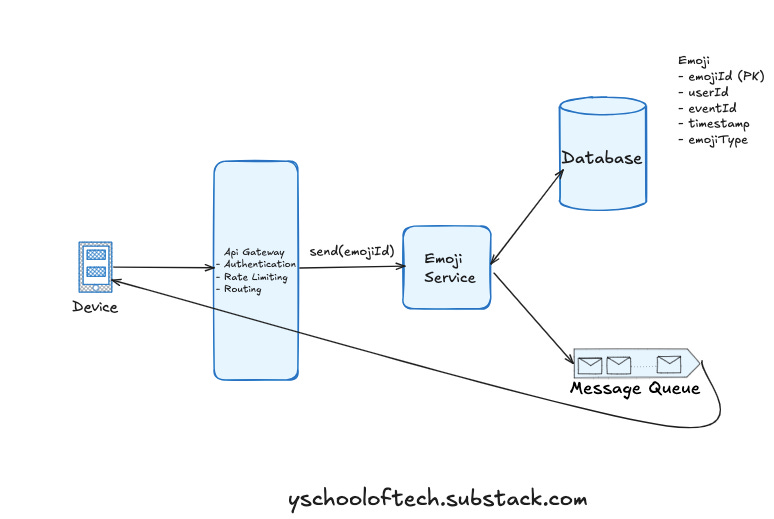 After Emoji Service receives the emoji, it publishes emojis to a topic within a message queue, tagged with the eventId.