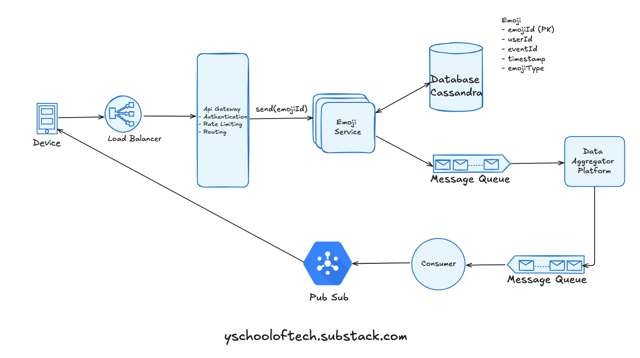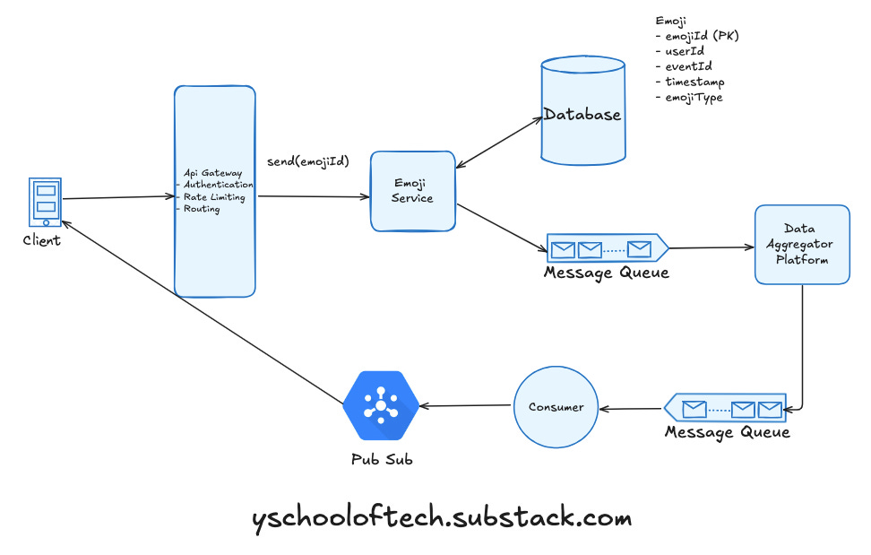 Streaming Platform: We use streaming platforms like Flink, Spark, Storm, or Kafka Streams to aggregate emojis in batches (e.g., every second).