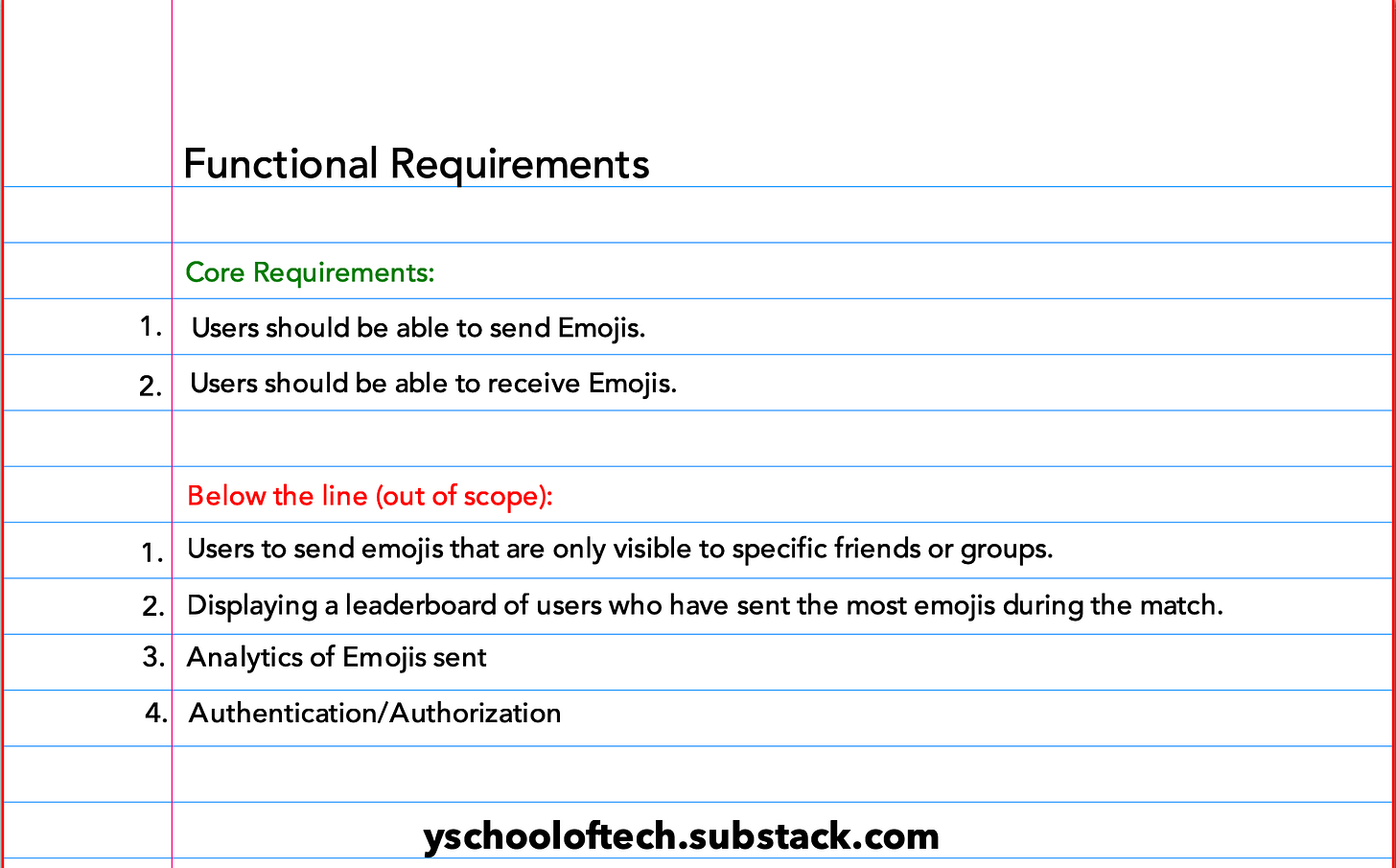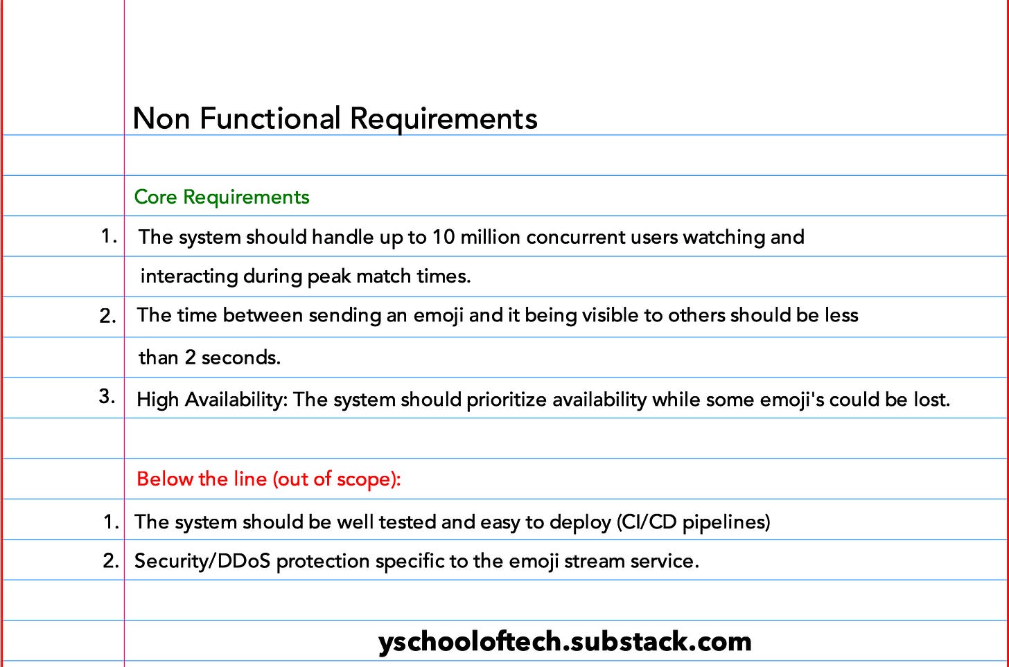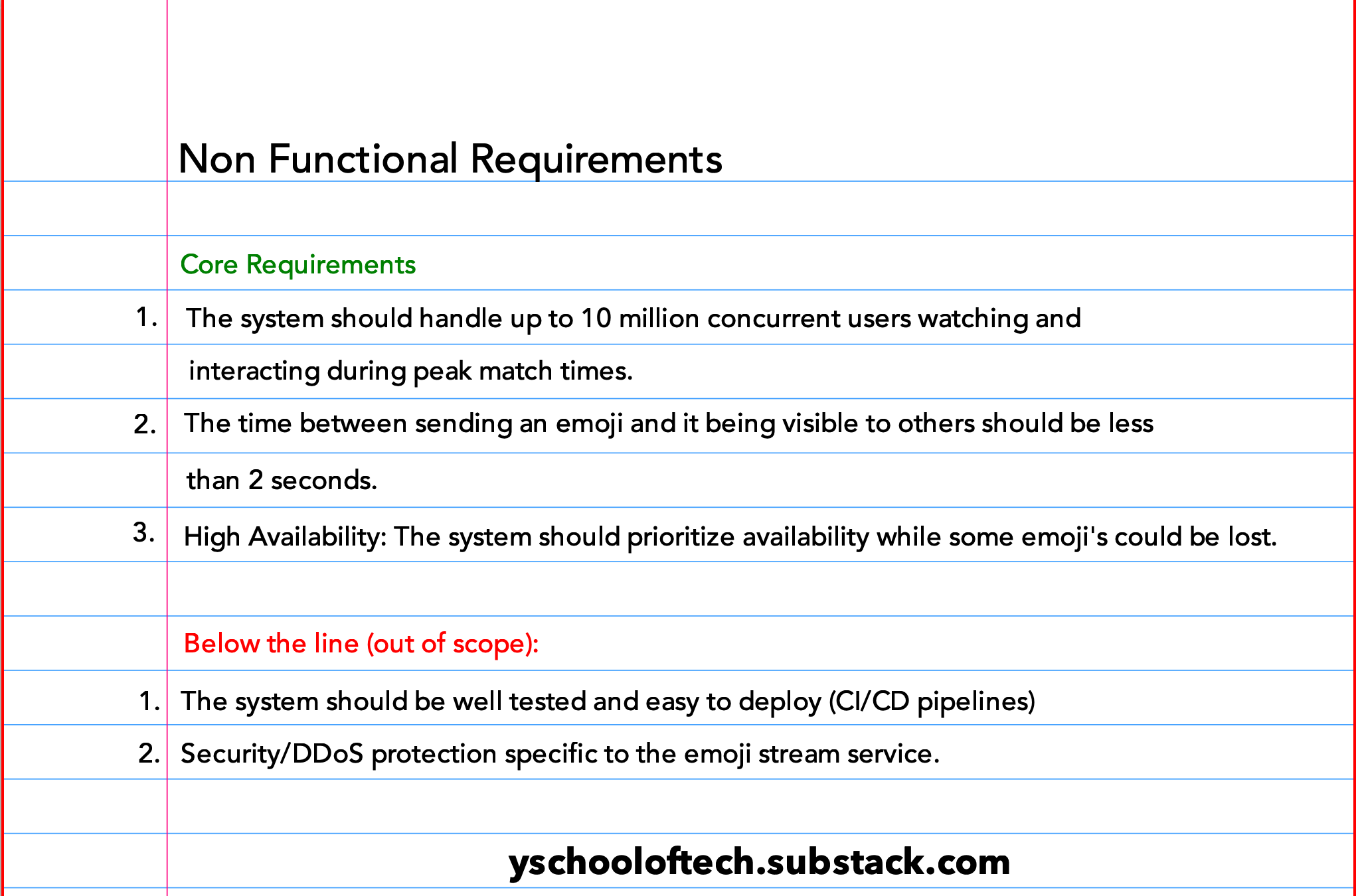 Do not just write down the cliche words only that I will make system scalable, fault-tolerant, resiliency etc. Instead, focus on precise, actionable requirements like